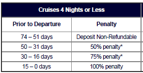 If you cancel for a reason not covered by insurance, you will loose the amount listed in the chart above. You can change your sail date up to 30 days before sailing. You can change one name on the reservation up to 8 days before sailing.